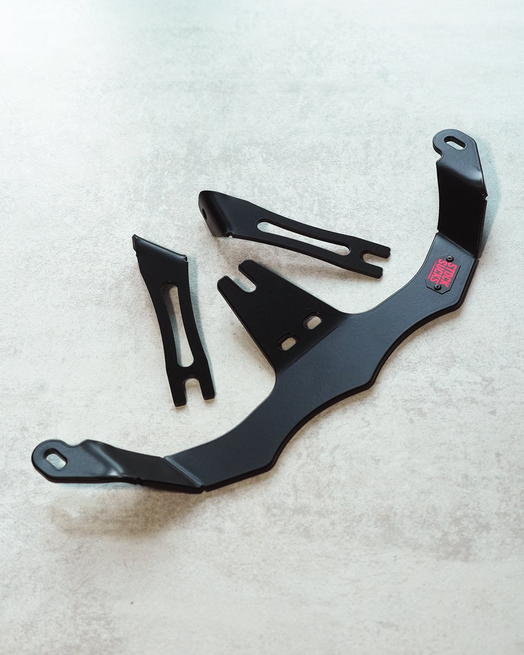 Кронштейн виконаний із двох матеріалів: основна частина з алюмінію, завдяки чому він дуже легкий, а самі вуха кріплення — з нержавіючої сталі. Таке поєднання дозволило зробити конструкцію надлегкою, щоб не додавати мотоциклу зайвої ваги.